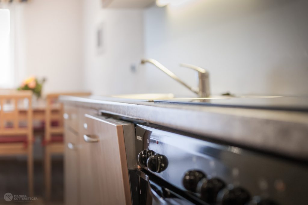 Induktionsherd, Kühlschrank, Spülmaschine, Geschirrtücher, Kaffeemaschine, Geschirr und Besteck